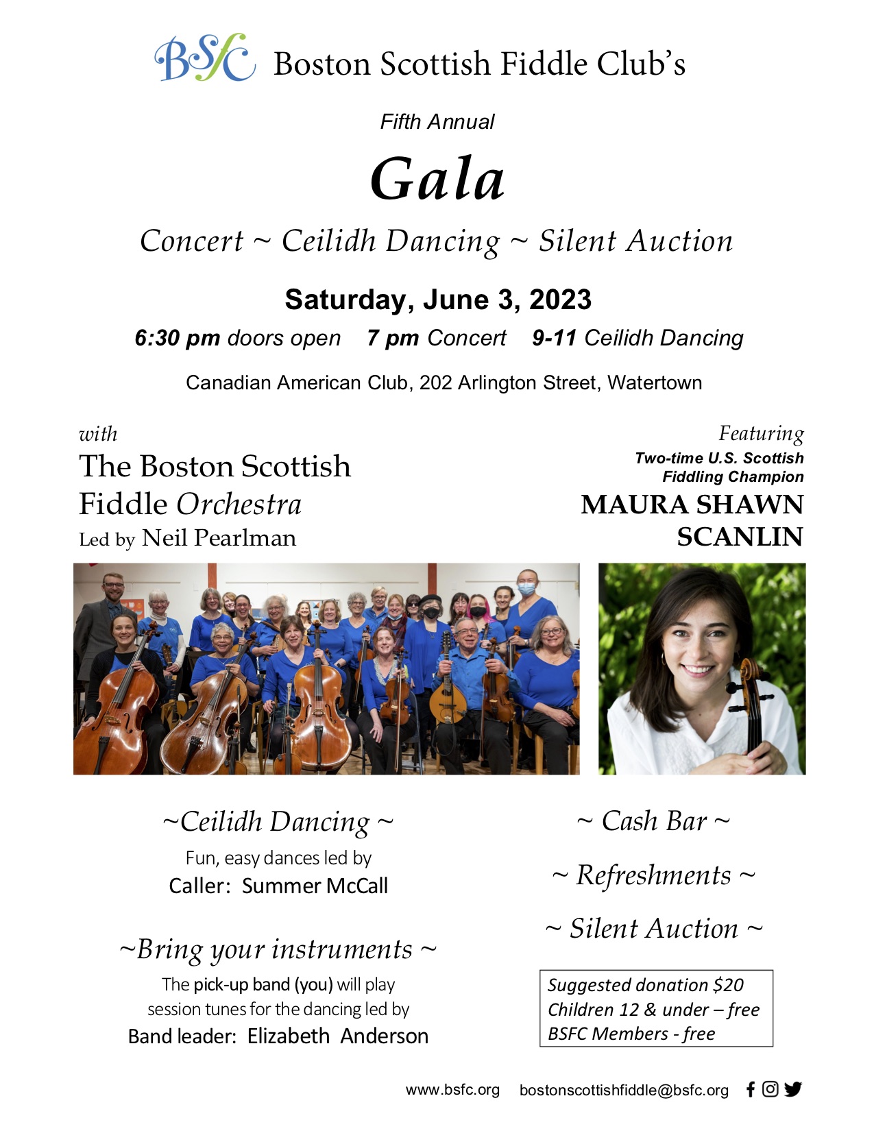 Join us for our annual gala fundraiser at the Canadian American Club on Saturday, June 3, 2023. Our special guest this year will be Maura Shawn Scanlin, playing with the Boston Scottish Fiddle Orchestra. We will have another fabulous silent auction and some ceilidh dancing with Summer McCall. If you’d rather join the band, bring your fiddle and join Elizabeth Anderson in danceable Scottish and Cape Breton tunes.